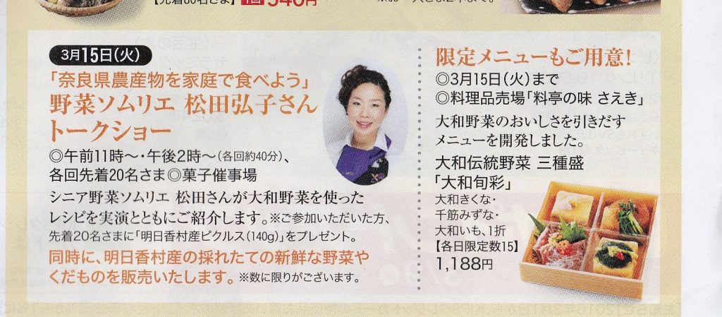 近鉄百貨店橿原店にて「奈良県産農産物を家庭で食べよう」トークイベントを行います。